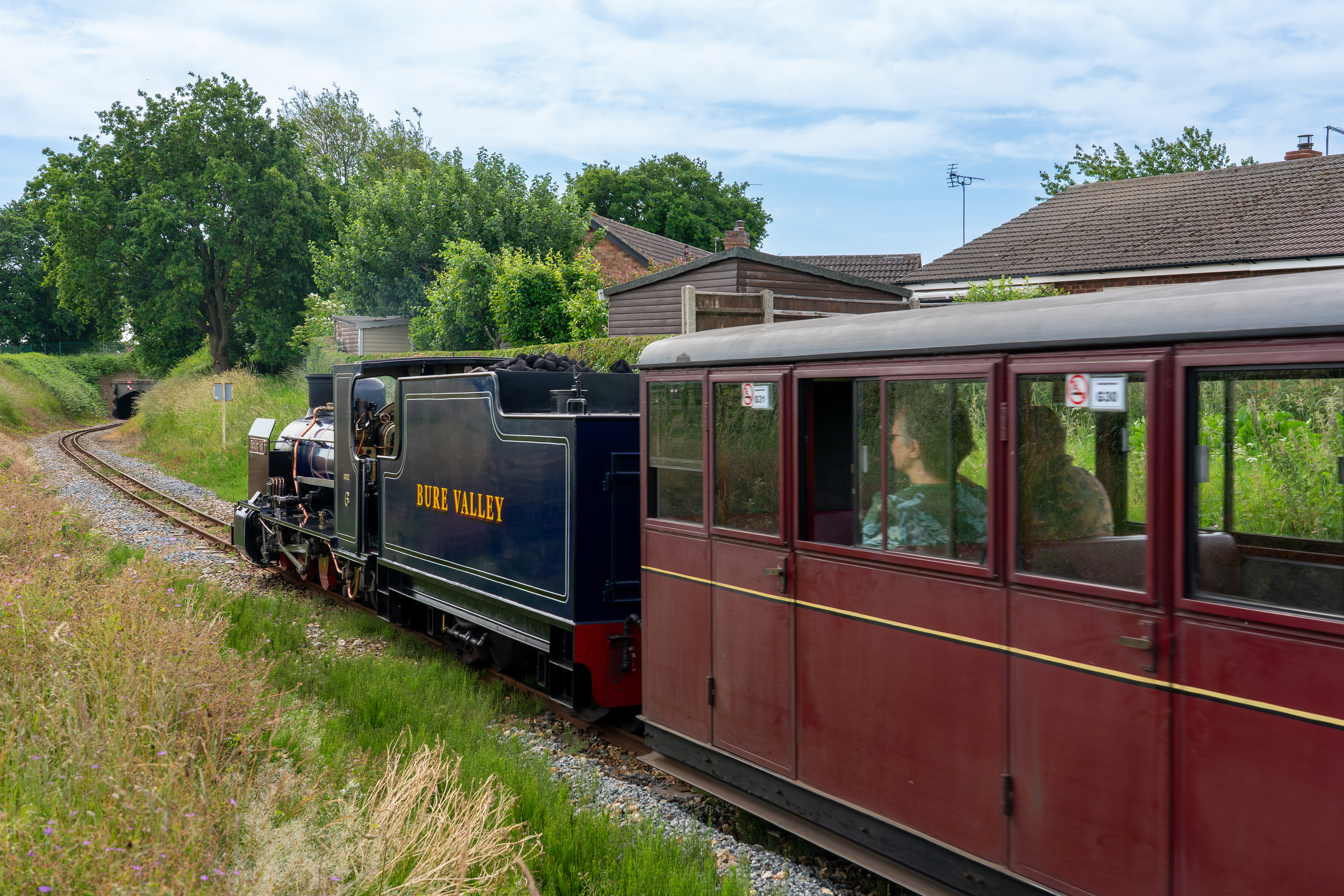 The scenic train ride across the Norfolk countryside, follows the meandering River Bure past tranquil meadowland and ancient pastures through the villages of Brampton, Buxton and Coltishall.